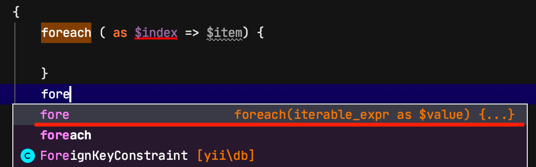 输入 fore 按下回车生成 foreach 代码块 (Goland 也有类似的快捷短语)